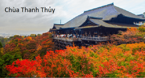 - Chùa Thanh Thuỷ – Kiyomizu Dera, một trong những ngôi đền linh thiêng nhất của xứ sở hoa anh đào với lối kiến trúc độc đáo hoàn toàn bằng gỗ, nằm trên vùng cao ngọn đồi Higashiyama. Toà nhà chính được thiết kế trông giống như 1 kho báu của quốc gia, được nâng đỡ bởi 139 chiếc cột cao 15m. Chùa Kiyomizu được UNESCO công nhận là Di sản Văn hoá năm 1994.